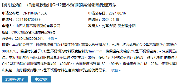 2024年8月16日,山西太鋼不銹鋼股份有限公司成功申請一項名為“一種建筑模板用Cr12型不銹鋼的高強化熱處理方法”專利,申請公布號為CN118497455A,申請日期為2024年4月19日。
