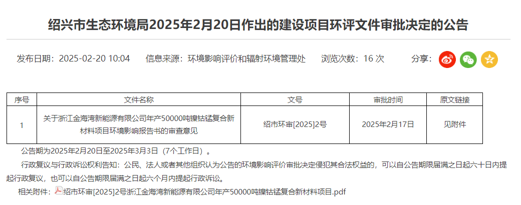 2025年2月20日,紹興市生態環境局就浙江金海灣新能源有限公司年產50000噸鎳鈷錳復合新材料項目環境影響報告書作出審查意見并對外進行公告,公告期:2025年2月20日至2025年3月3日(7個工作日)。