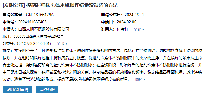 2024年6月11日,山西太鋼不銹鋼股份有限公司成功申請一項(xiàng)名為“控制超純鐵素體不銹鋼連鑄卷渣缺陷的方法”專利,申請公布號CN118166179A,申請日期為2024年2月6日。