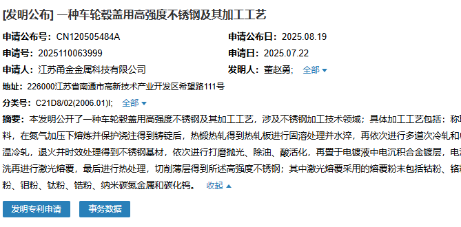 8月19日,江蘇甬金金屬科技有限公司成功申請一項名為“一種車輪轂蓋用高強度不銹鋼及其加工工藝”專利,申請公布號為CN120505484A,申請日期為2025年7月22日。