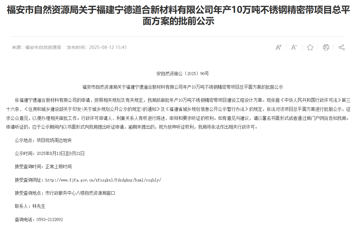 2025年8月12日,福安市自然資源局就福建寧德道合新材料有限公司年產(chǎn)10萬噸不銹鋼精密帶項(xiàng)目總平面方案對外進(jìn)行批前公示,公示時(shí)間:2025年8月13日至8月21日。