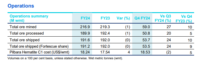 產量方面,2024財年第四財季,該公司鐵礦石開采量為5900萬噸,環比增27%,同比增10%;鐵礦石處理量為5080萬噸,環比增20%,同比增5%。